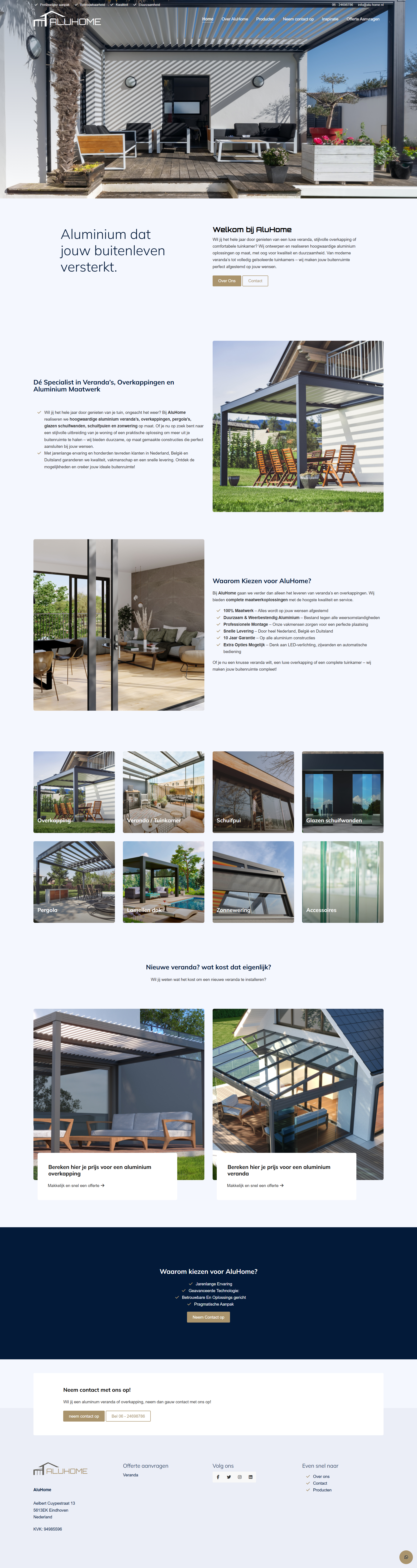 Voor AluHome hebben we een website ontwikkeld die perfect past bij de luxe en hoogwaardige uitstraling van hun producten. AluHome specialiseert zich in exclusieve aluminium overkappingen en veranda’s, en dat gevoel van kwaliteit en maatwerk wilden we ook in de website terug laten komen.
